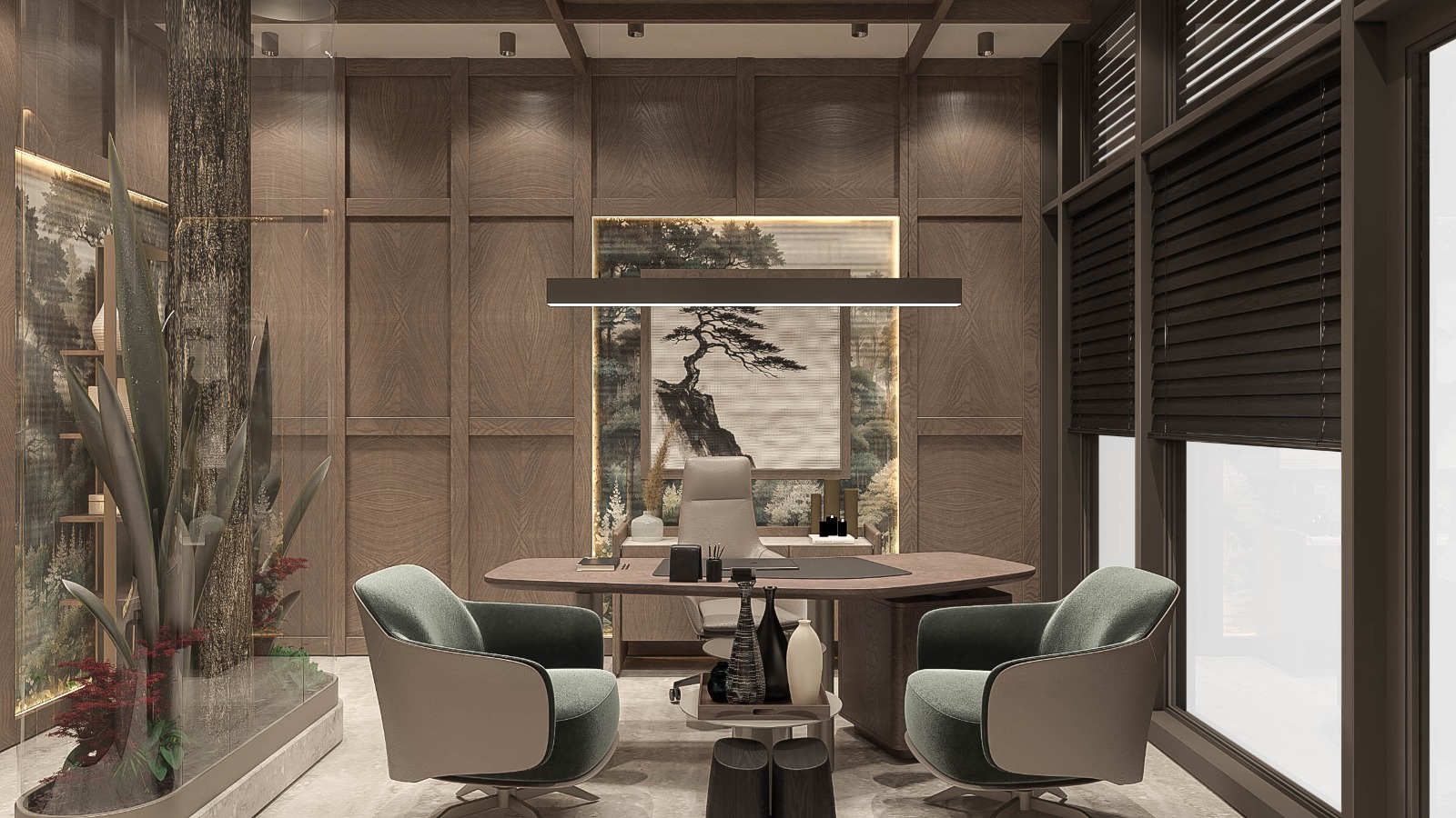 A prestigious executive office designed with custom furniture and tailored interior solutions, creating a refined and professional workspace.